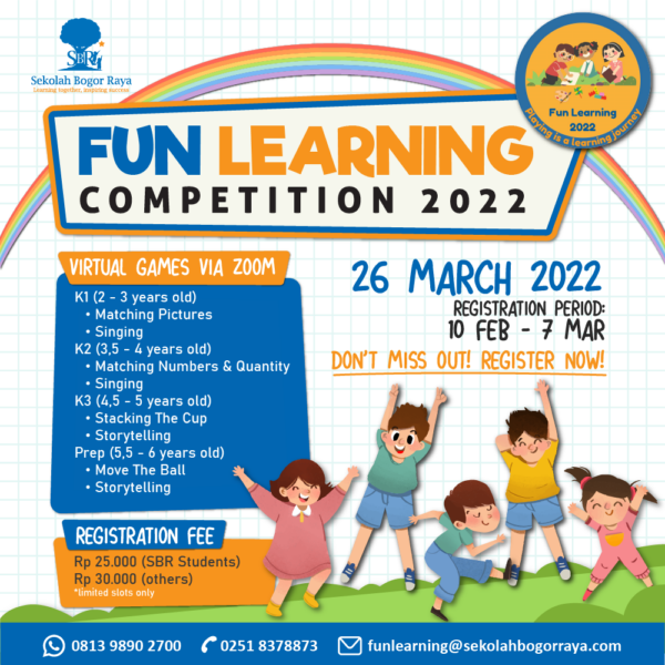 PG-K Sekolah Bogor Raya proudly presents: Fun Learning 2022 🎉 Let’s join the Fun Learning 2022! For more information: e-mail: funlearning@sekolahbogorraya.com Contact Person: Ferizka 0813-9890-2700 / 0251-837873